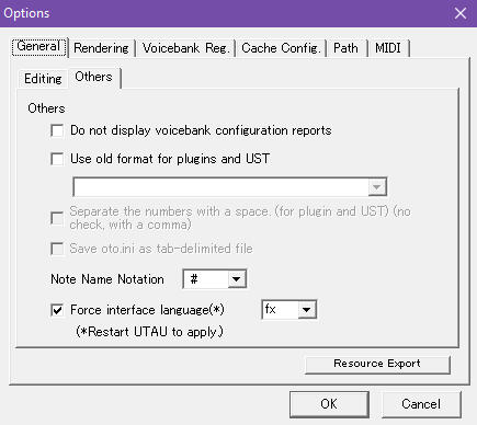 Then, in the UTAU Options menu, under General and again under the Others tab, go to Force interface language text box and type in "fx" without quotes.